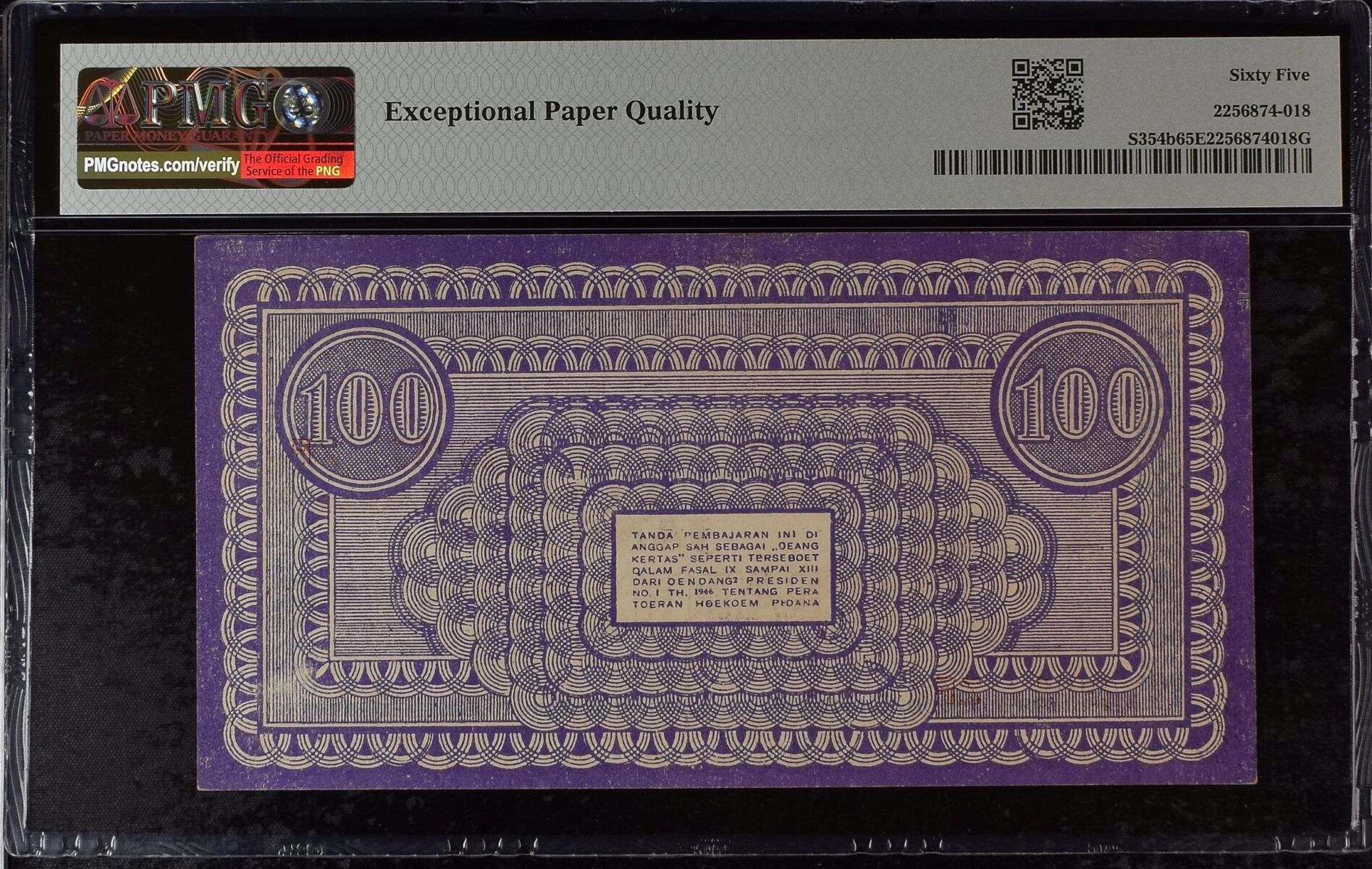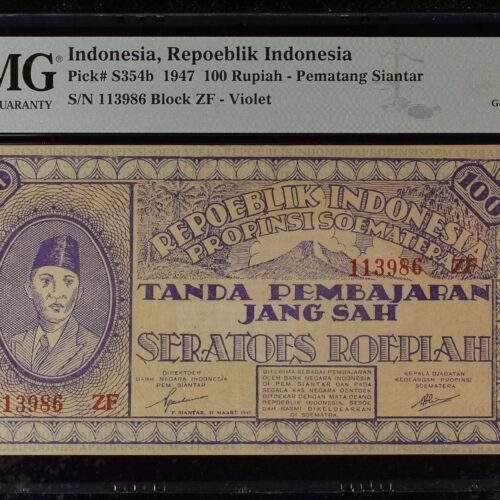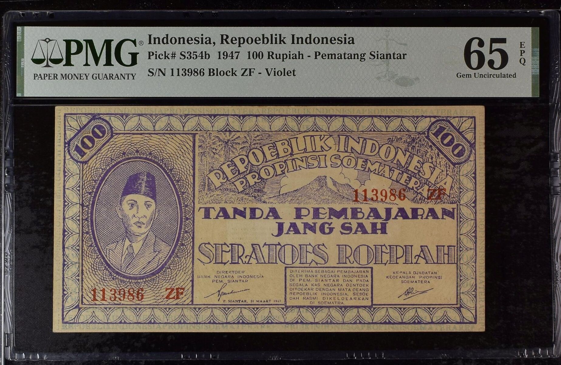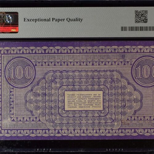 [LOT 199 NA#85] SECOND TOP POP INDONESIA, 100 RUPIAH ORIDA PEMATANG SIANTAR VIOLET PMG GEM UNC 65 EPQ 1947 SERIAL # 113986 BLOCK ZF