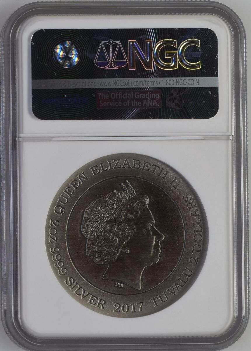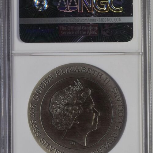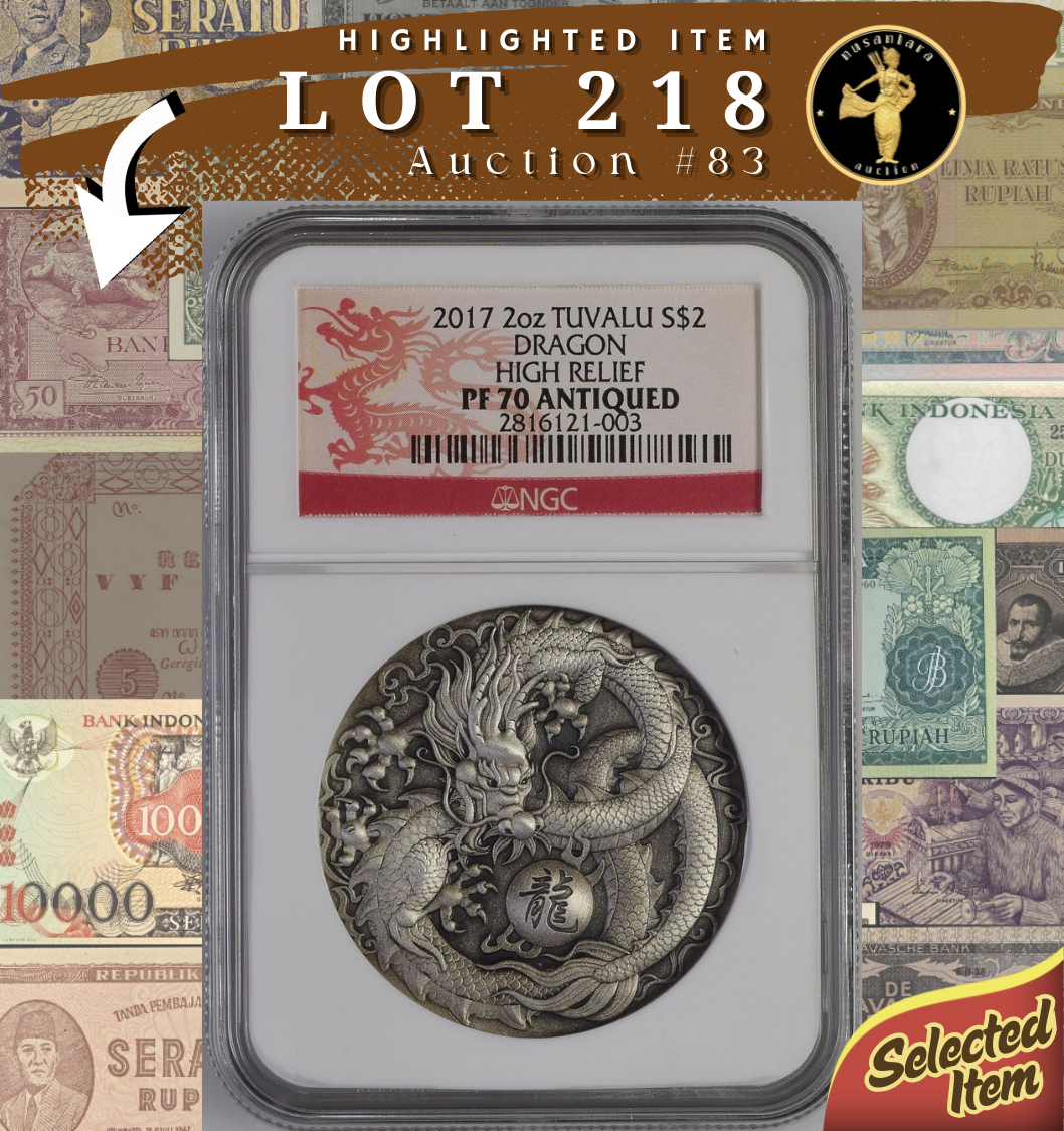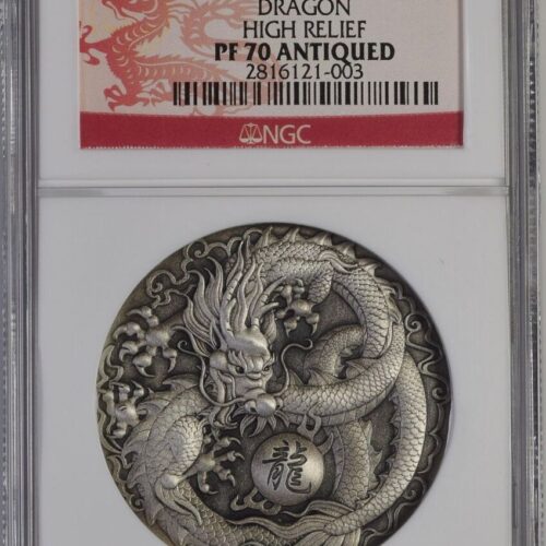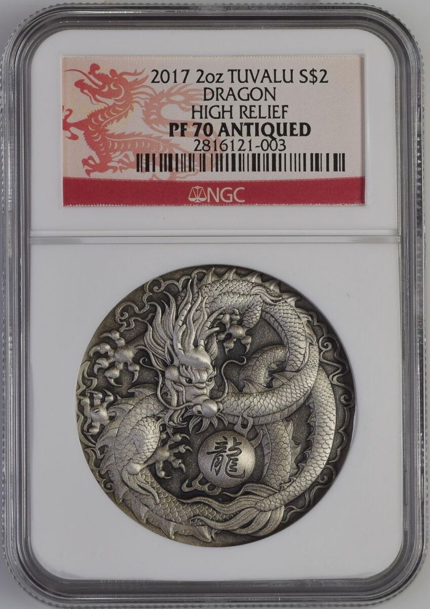 [LOT 218 NA#83] TUVALU, 2 DOLLARS SILVER COIN DRAGON HIGH RELIEF NGC PF 70 ANTIQUED 2017