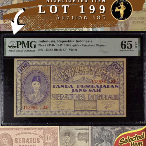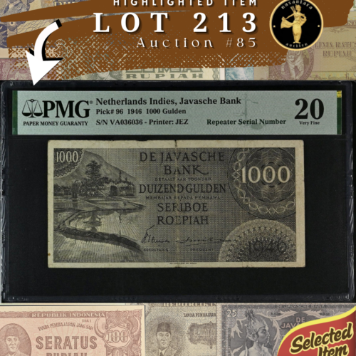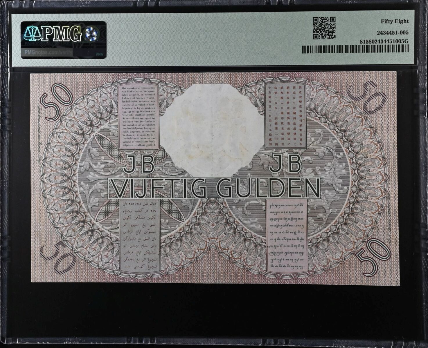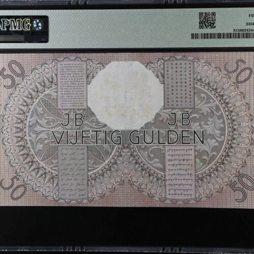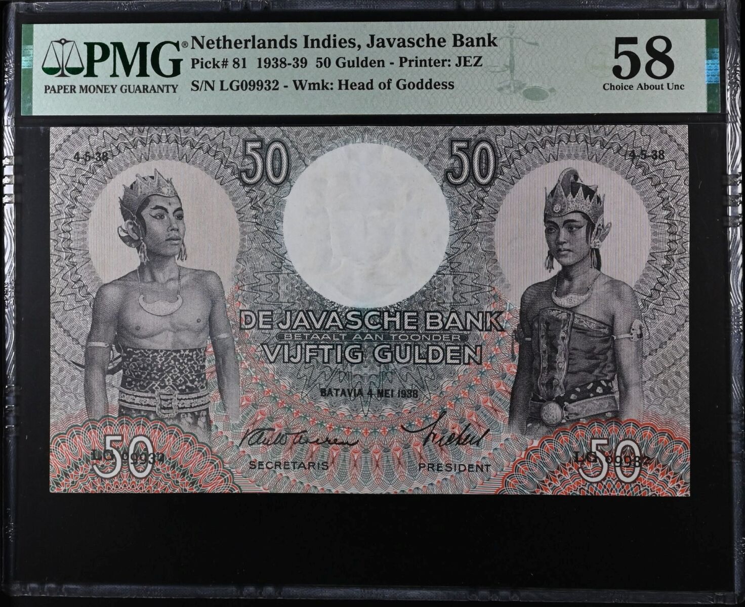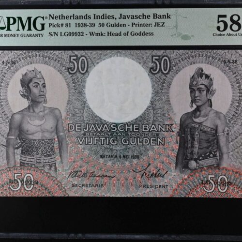 [LOT 224 NA #85] RARE NETHERLANDS INDIES, 50 GULDEN WAYANG WAVEREN PMG CHOICE ABOUT UNC 58 1938 SERIAL# LG09932