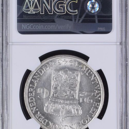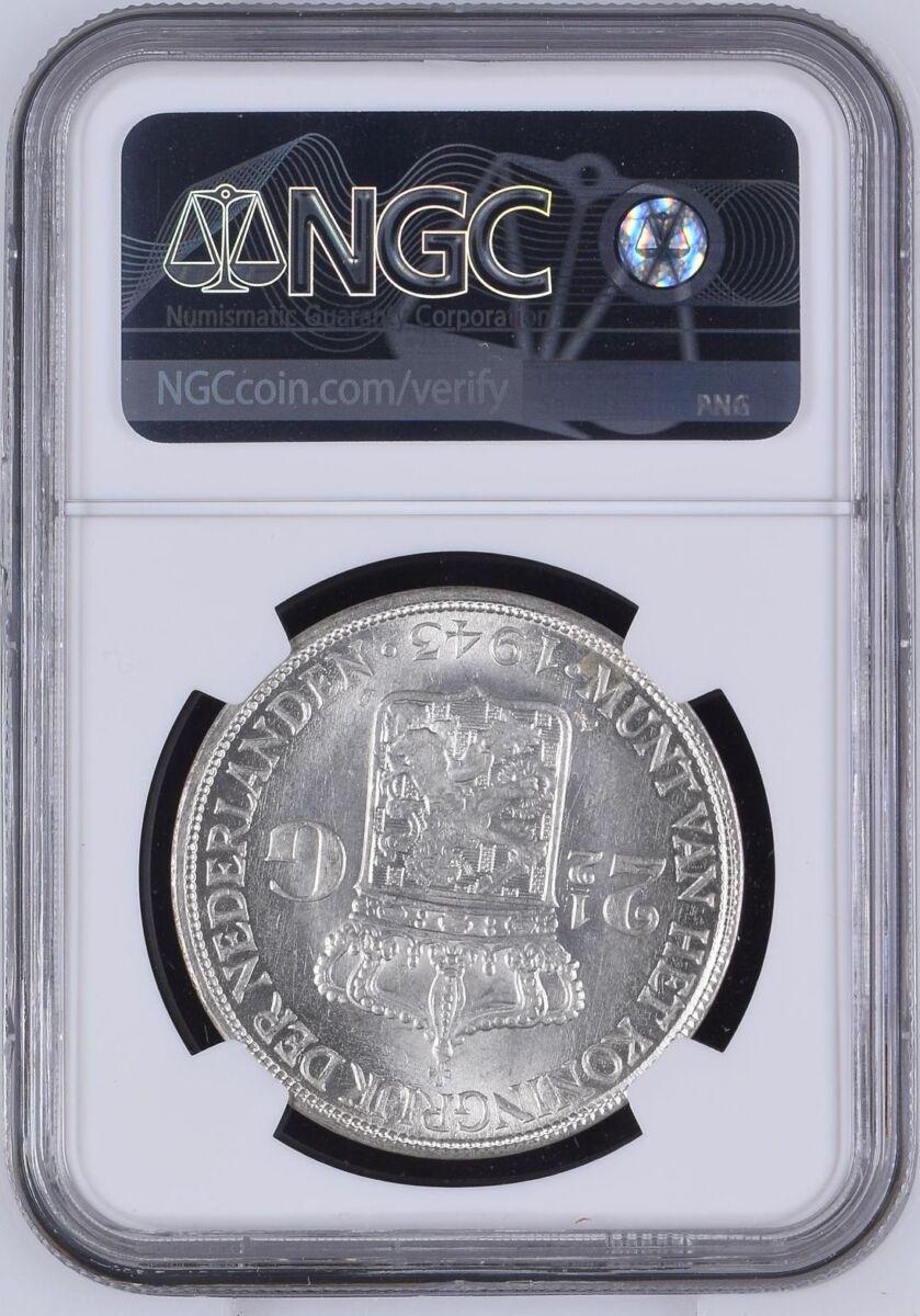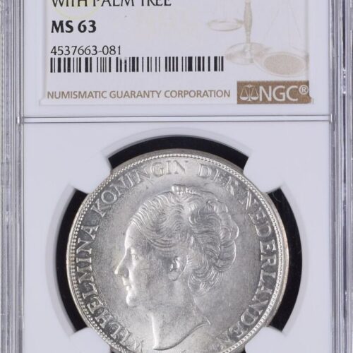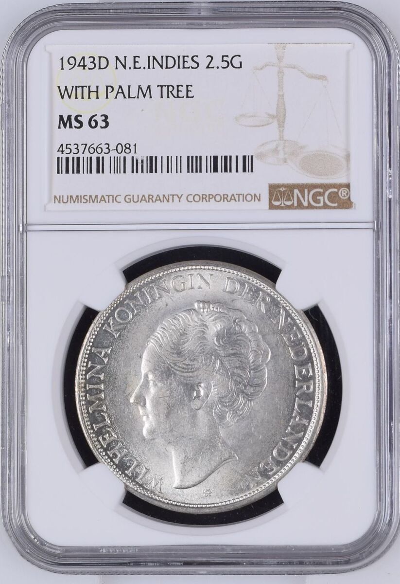 [LOT 319 NA#78] NETHERLANDS EAST INDIES, 2.5 GULDEN WILHELMINA WITH PLAM TREE NGC MS 63 1943D