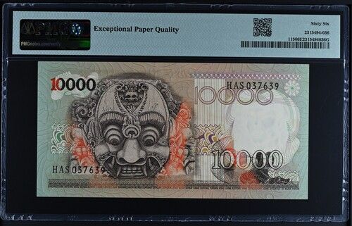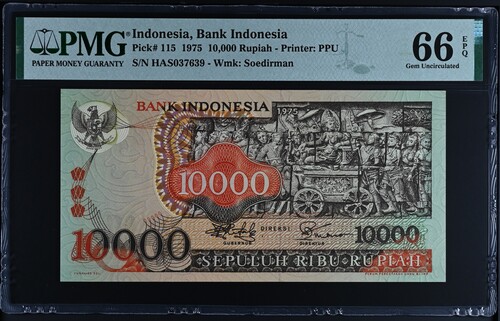 [LOT 365 NA#59] INDONESIA, 10.000 RUPIAH BARONG PMG GEM UNC 66 EPQ 1975 SERIAL# HAS037639