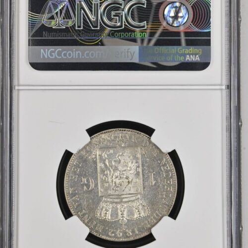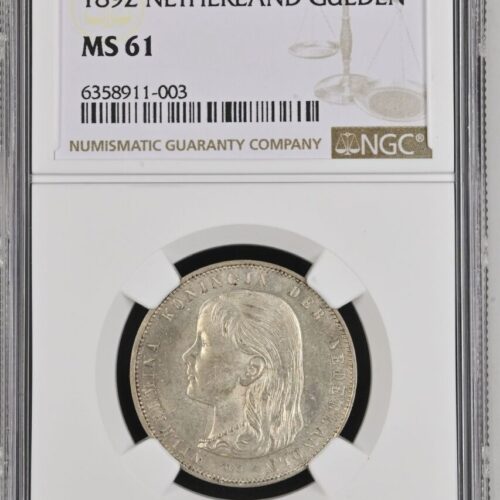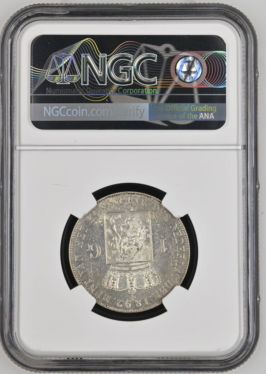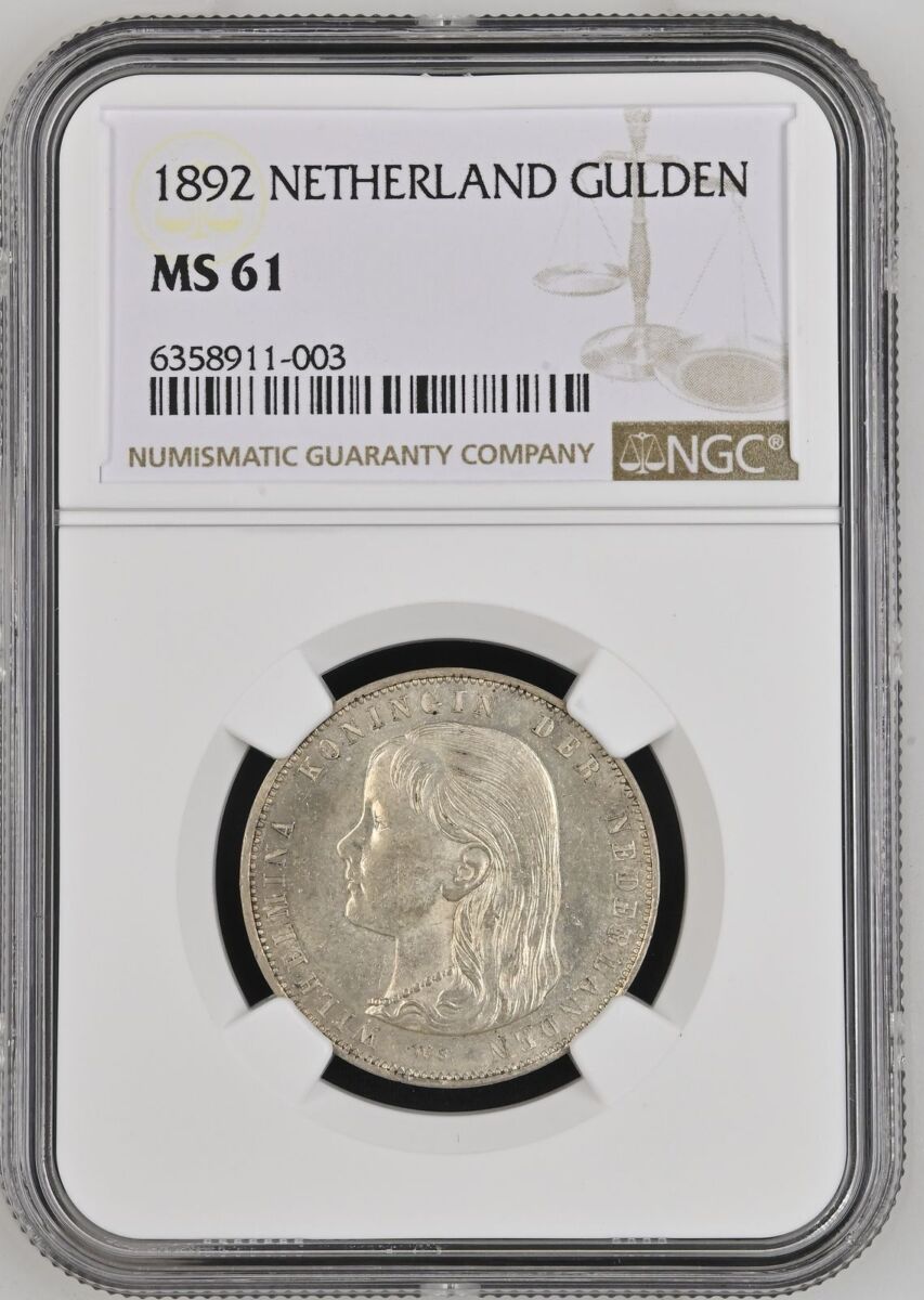 [LOT 397 NA#66] NETHERLANDS, 1 GULDEN WIHELMINA LONG HAIR NGC MS 61 1892