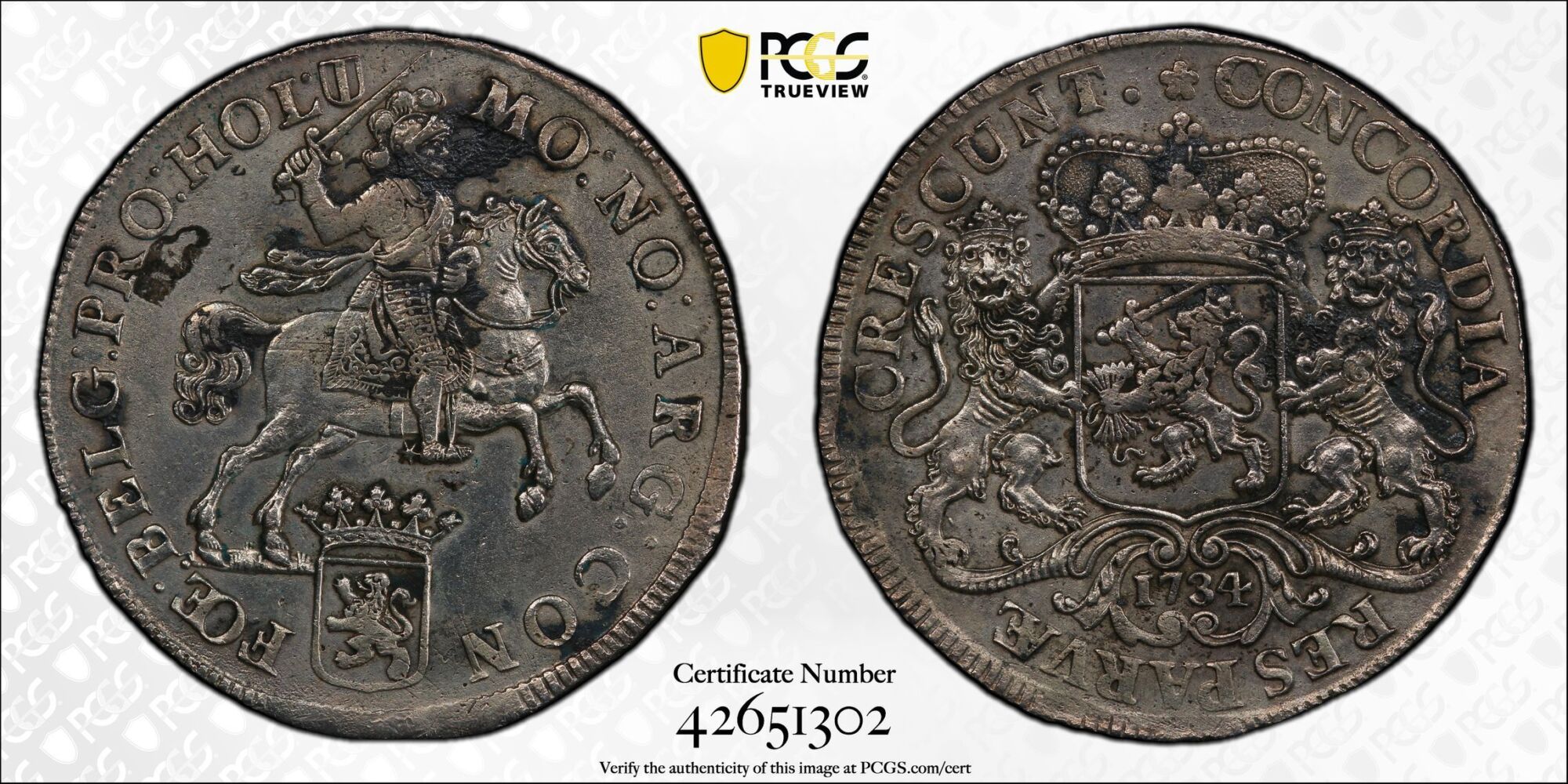 [LOT 398 NA#66] NETHERLAND, DUCATON PCGS GENUINE HARDHLY CLEANED-AU DETAIL 1734