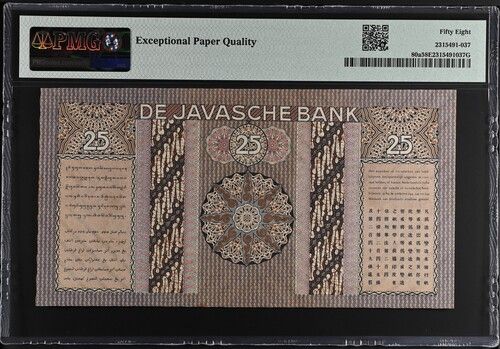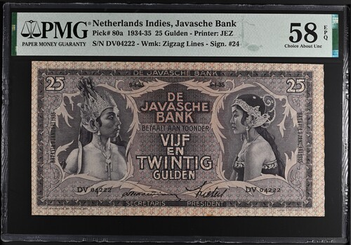 [LOT 430 NA#59] NETHERLANDS INDIES, 25 GULDEN WAYANG PMG CHOICE ABOUT UNC 58 EPQ 1934-35 SERIAL# DV04222