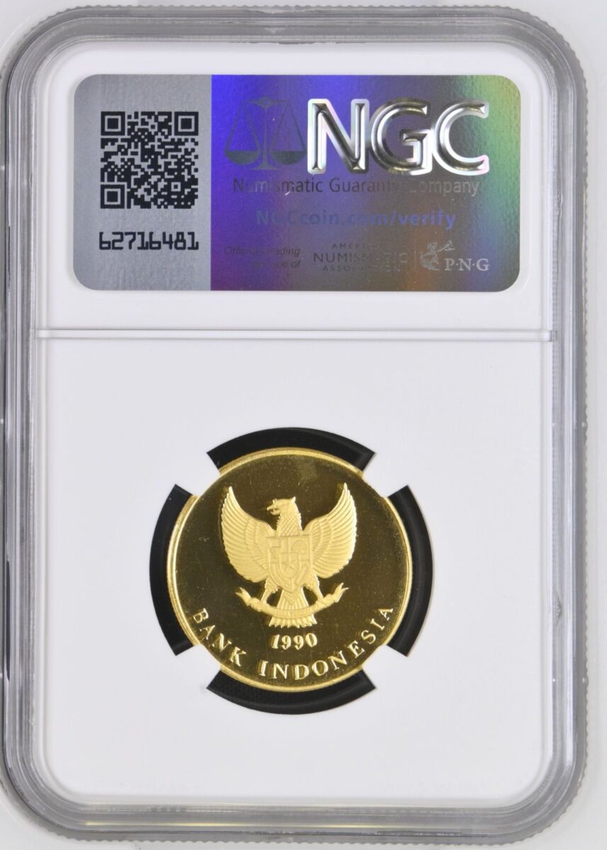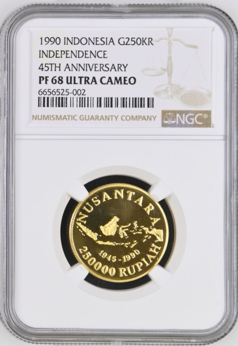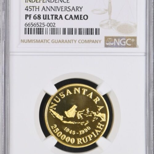 [LOT 462 NA#59] INDONESIA, 250KR GOLD COIN INDENPENDENCE 45TH ANNIVERSARY NGC PF 68 ULTRA CAMEO 1990