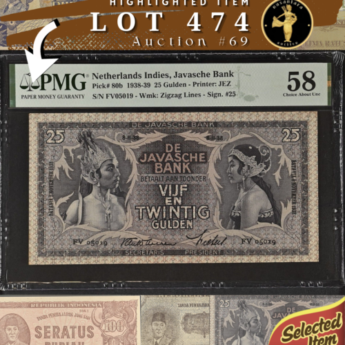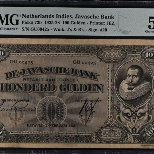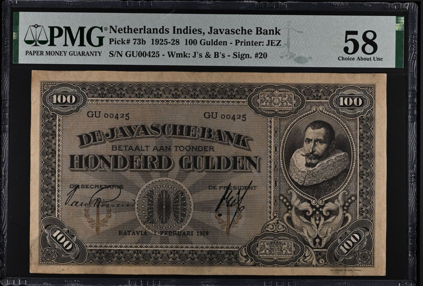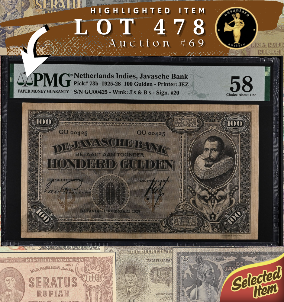[LOT 478 NA#69] NETHERLANDS INDIES, 100 GULDEN COEN PMG CHOICE ABOUT UNC 58 1928 SERIAL# GU00425